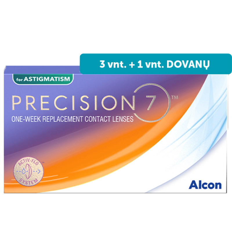 PRECISION7® for Astigmatism – tai pažangūs savaitiniai toriniai silikoniniai hidrogeliniai kontaktiniai lęšiai, skirti astigmatizmo korekcijai. Sukurti užtikrinti stabilų, ryškų matymą ir ilgalaikį komfortą visą savaitę, šie lęšiai pasižymi ACTIV-FLO® technologija, padedančia išlaikyti drėgmę ir gaivumo pojūtį net iki 7-os dienos. PRECISION7® for Astigmatism – tai patikimas pasirinkimas žmonėms su astigmatizmu, kurie ieško stabilaus matymo ir ilgalaikio komforto. Dėl pažangios technologijos ir stabilios konstrukcijos šie lęšiai leidžia aiškiai matyti visą savaitę, o patogus keitimo režimas užtikrina geresnę higieną ir paprastesnę priežiūrą.